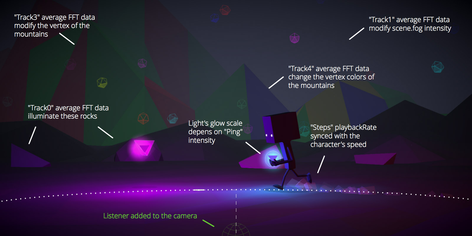 In the end I managed work with the mean value of the FFT which we imported from the analyzer for each sound. So depending on the intensity, we modified the parameters of various graphic elements of the scene. It was also was very effective synchronize playbackRate loop for steps with the speed of the character, which automatically synced with the sound of the character’s footsteps.