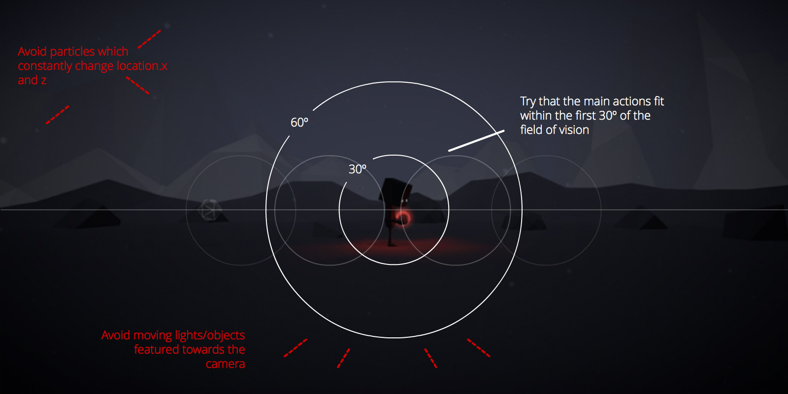 One of the main lessons is that there are things that result in attractive views on the computer screen but turn out to be annoying in VR. In the former, you have to avoid making the viewer constantly refocus their attention. Avoid making several elements move in separate directions at once as it tires the eyes out quickly from trying to focus on them.