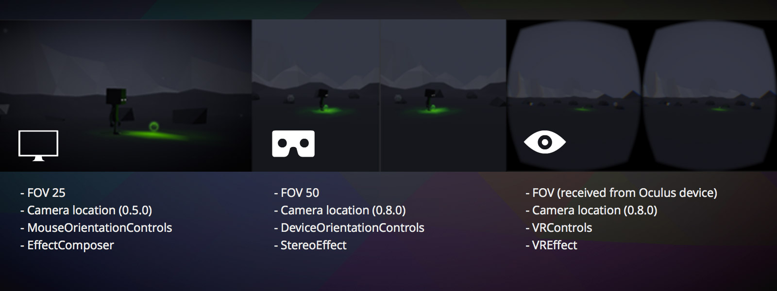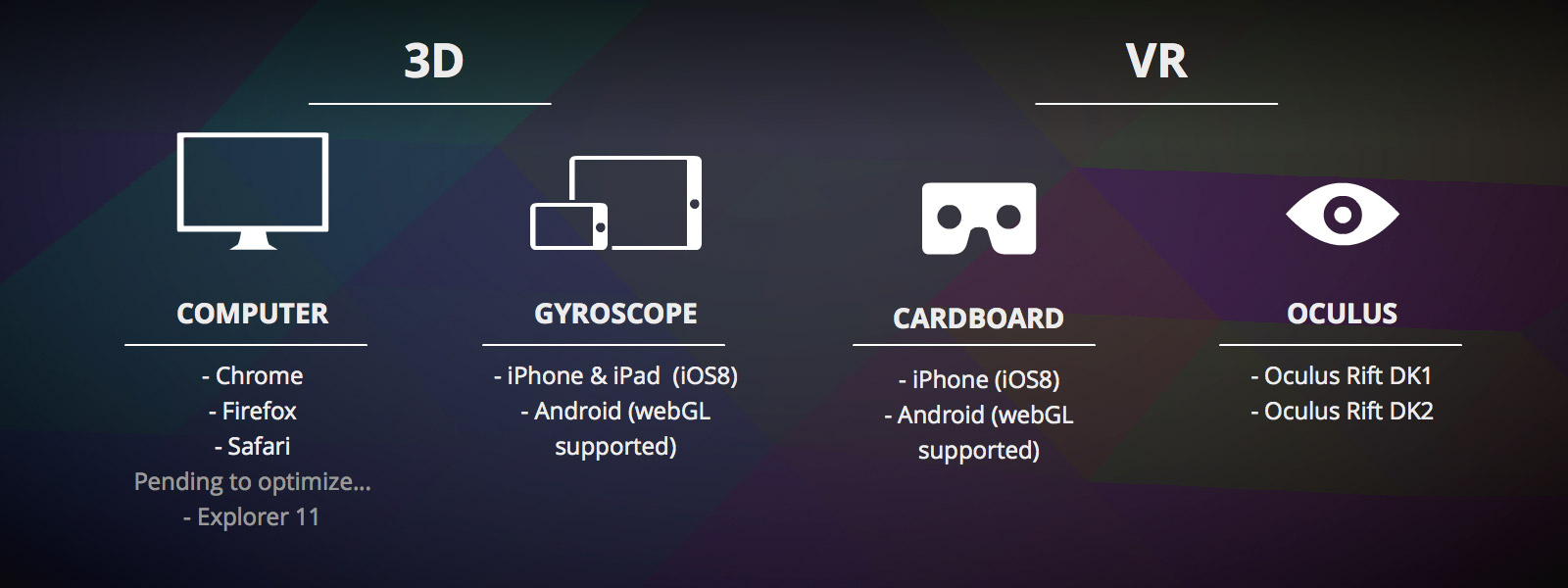 For this reason, you can view it on your computer (locking the mouse cursor when the experience begins), on smartphone with a gyroscope or a WebGL-ready tablet (particularly for the many iPad users), with Cardboard for the half million owners of this headset (at this point it was key for me to get it to work for iPhone users) and you also have the VR option to use an Oculus Rift device, and all of it needed to work through the browser.