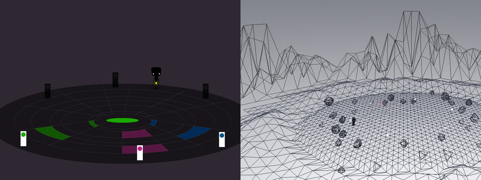 The original idea was for the lights to create a circle along which our hero was moving. Each light would emit color and a different sound when placed on its pedestal.