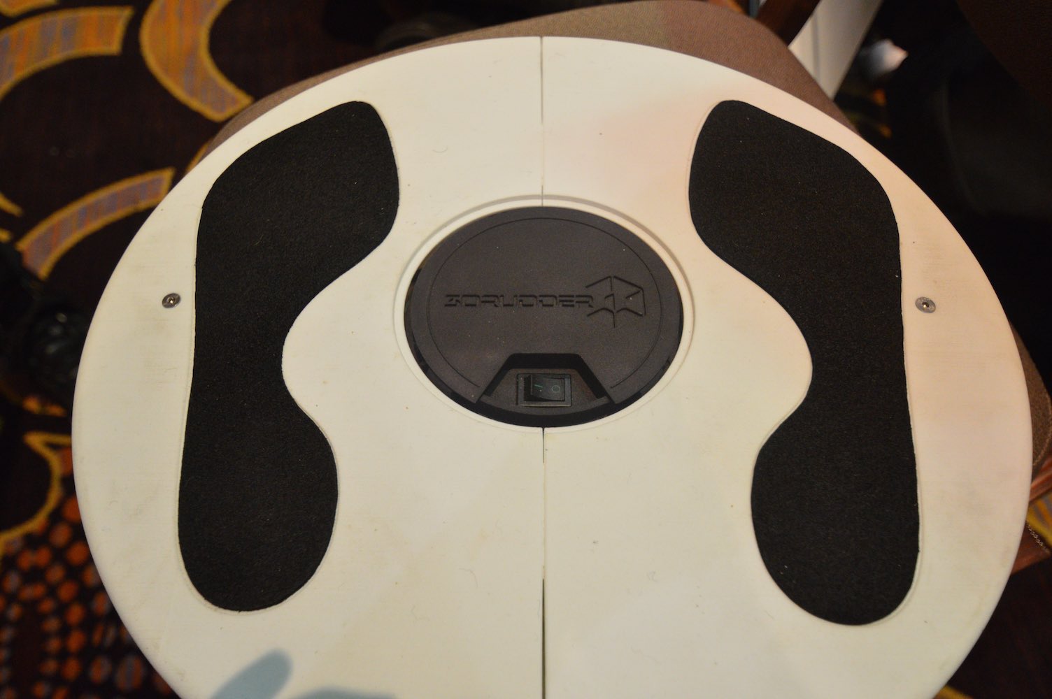 The device is essentially a disc with a soft semi-sphere underneath which allows pivoting of the device. It has two pressure sensitive areas for your feet that can detect whether your feet are resting on the device of lifted off.