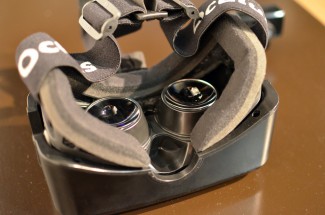 Sony’s Project Morpheus headset uses a head mounted design that is closer to flip-down welding glasses than the ski goggle design of the DK1 and DK2. At this point, Morpheus is more comfortable to use with glasses as the display hangs down in front of your eyes instead of pressing against your face. It still suffers reduced FOV when using glasses because of an increase in the eye to lens distance.