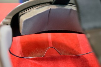 The new display tech uses a smartphone display mounted above the plastic shield which serves as the reflective medium to bounce light from the display into your eyes. On the inside, the plastic shield is shaped concavely to aim one half of the smartphone’s display into your left eye and, and the other half into your right. These concave segments use a faintly silvered coating to reflect the light coming from the angle of the smartphone display, but still allow light to penetrate through to your eyes from the outside, effectively creating a transparent display that doesn’t darkly tint the outside world.