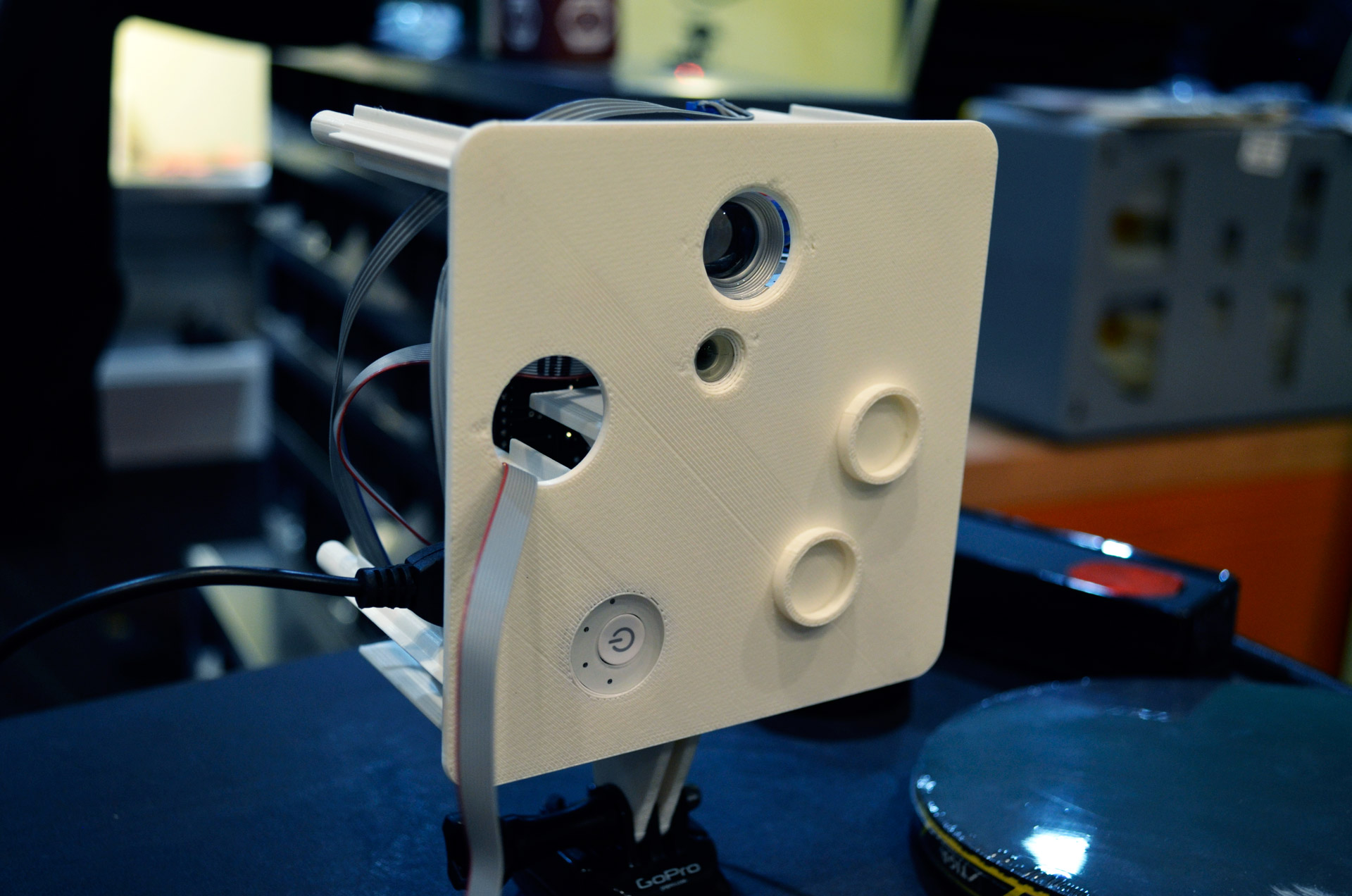 At this point McCauley returns the lift to the second floor and we head back to the middle of the workshop. Amidst huge tool boxes and complex machinery is a small 3D printed white enclosure attached to a wheeled worktray by a GoPro mount. This is what I came to see.