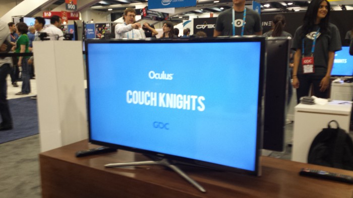 The newest demo to join the Oculus stable is Couch Knights, an interesting action title made in collaboration with the Unreal Engine team. Couch Knights is a 2-player experience, in which your avatar is a standard looking guy in a standard looking living room sitting on a couch. A TV in the room looks as if it will keep score for the game. Looking down reveals that your avatar is holding a controller – it invokes a similar feeling to Lunar Flight. Positional tracking was fully functional, and I could not help leaning every which-way in the chair to test the limits. In this particular demo, it seems as if the positional tracking is 1:1. Everything felt very natural. The real kicker is that when you look across the room, you see your opponent’s avatar, complete with tracking! As the demo began, I looked at the guy across from me and gave him the standard head nod as a greeting. Non verbal communication in VR never gets old.