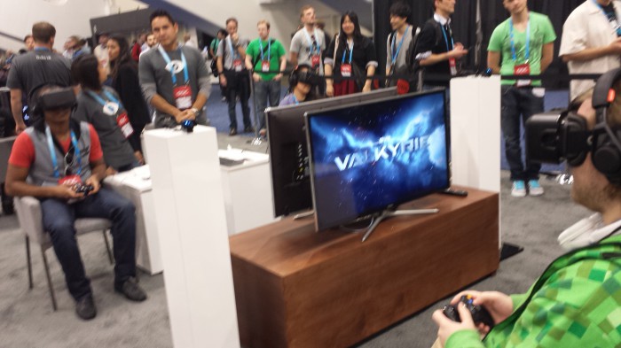 Two 4-player sessions of Valkyrie were setup. Each section had some fierce multiplayer spaceship dogfighting action! Most of the people in line were waiting to get a demo of Valkyrie, which has consistently impressed everywhere it has been demoed. The experience here was as expected: excellent. Even though it was my third or fourth time experiencing the demo, I still had a blast doing barrel rolls and blasting opponents out of the sky. As I have mentioned before, the positional tracking in Valkyrie seems exaggerated, allowing me to lean far forward into the cockpit to read all of the details on the neon displays.