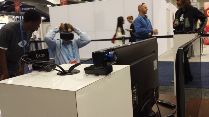 Every station had a DK2 unit, headphones, and a wireless Xbox 360 controller. An IR camera was positioned on a stand in front of each seat. There was also a TV facing each pair of stations, but interestingly most of the TVs did not display gameplay. Most either had a static image that referenced the demo at those stations, or a looping title graphic. I asked Product Lead Joe Chen about this change, and he responded that most are not able to get a real feel of the experience from watching the stereoscopic gameplay.