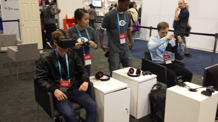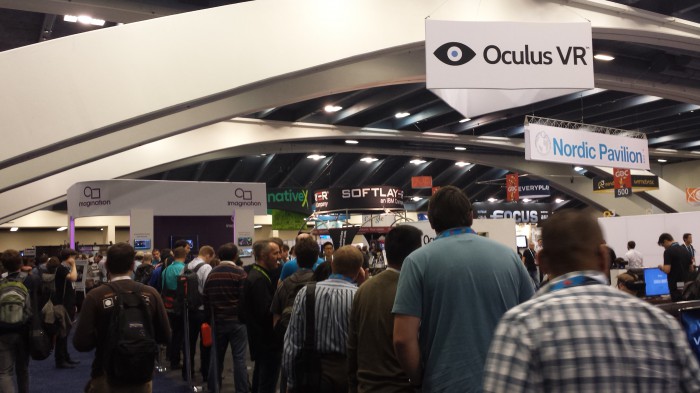 While VR enthusiasts scramble to get their orders in for the DK2, Oculus has been hard at work setting up and manning a booth at GDC. It was not a surprise that the booth was larger than last year, nor was it a surprise that it is once again packed with a line the entire day. However, it was surprising to see no less than 16 stations with DK2s ready to go.
