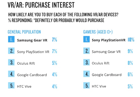 And in terms of gauging overall awareness of virtual reality platforms, Nielsen found that 34% of the general population over 13 years knew about the Gear VR, with the PlayStation VR recognised by 26% and the Oculus Rift 25%. Again, somewhat surprisingly, the HTC Vive trails at 10% recognition among those polled.