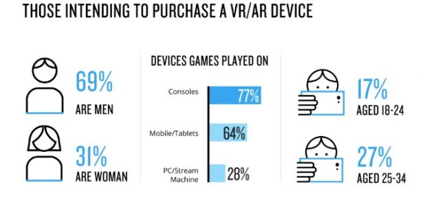 Nielsen’s ‘U.S Games 360 2017‘ report states that from over 2000 people (50% male/female split) interviewed, 27% of people aged between 25-34 said that they intended to buy a VR headset, with 17% of 18-24 year olds saying the same. Of that group, 69% were men, 31% were women.