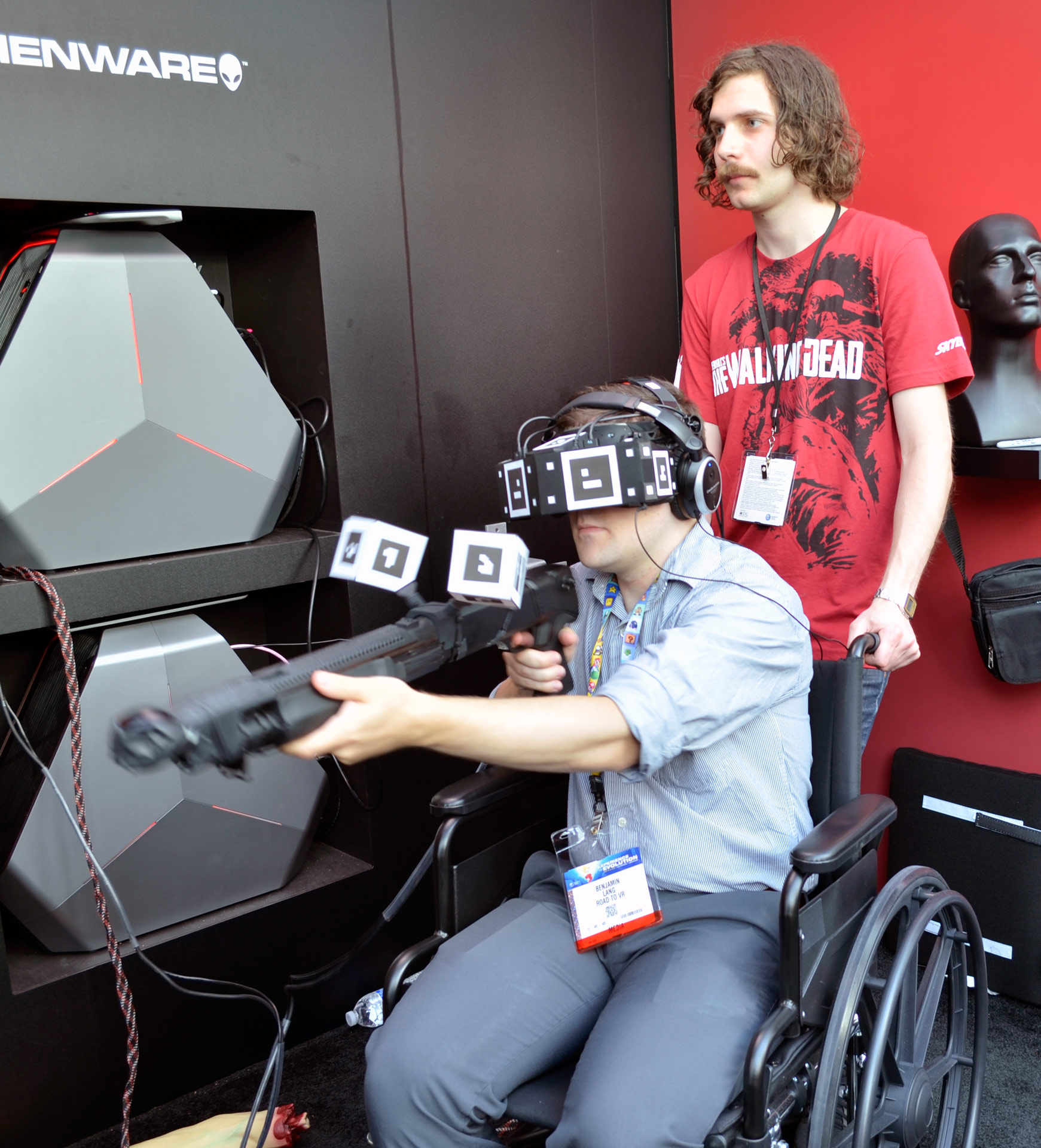 StarVR was launched this week alongside a dedicated made-for-VR experience based on the hugely popular The Walking Dead franchise and available this week at a dedicated stand just inside the LA Convention Center at E3 2015. Starbreeze’s cunningly located custom booth houses five demo pods, each comprising a StarVR headset, motion tracked pump-action shotgun, and… a wheelchair(?). You see, Starbreeze’s The Walking Dead VR offering goes the extra mile compared with most other virtual reality experiences present at E3 this year. The team wanted people to feel not only immersed but involved in the action, which means physical props and feedback.